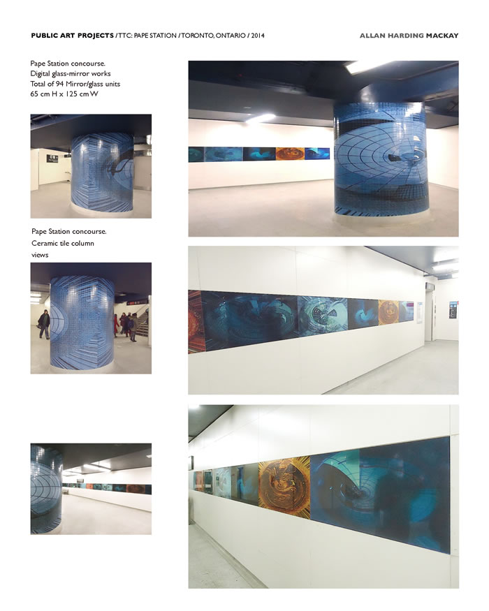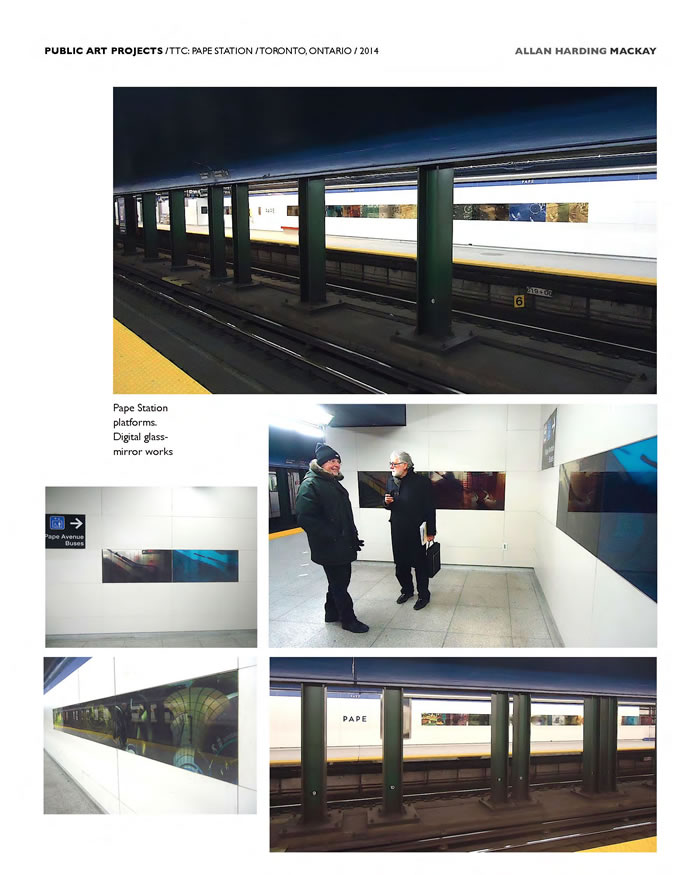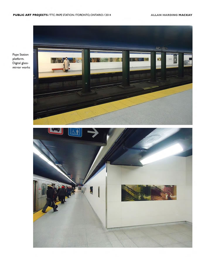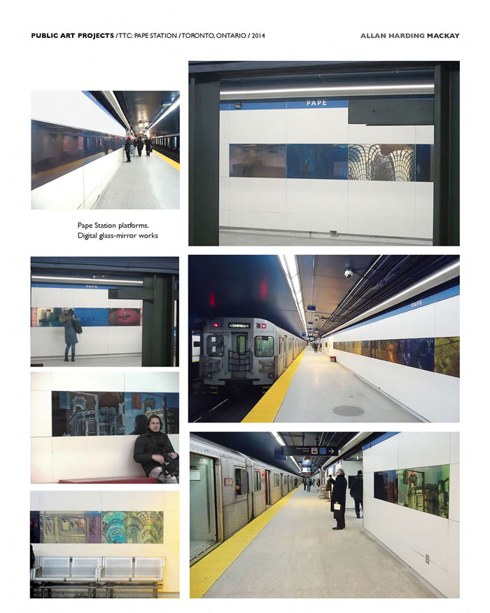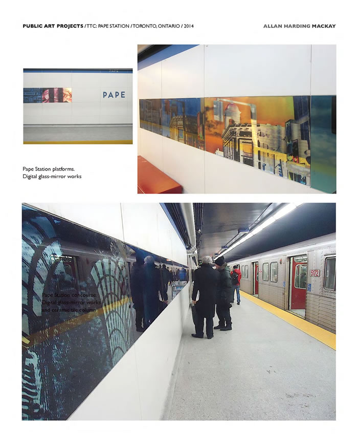 The Pape Subway art concept is based on images of existing interior architectural features of the subway and exterior neighbourhood images. The images are graphically transformed and applied in various materials i.e.: fused digital images with tempered and mirror glass, ceramic tile and etched granite and glass.