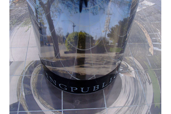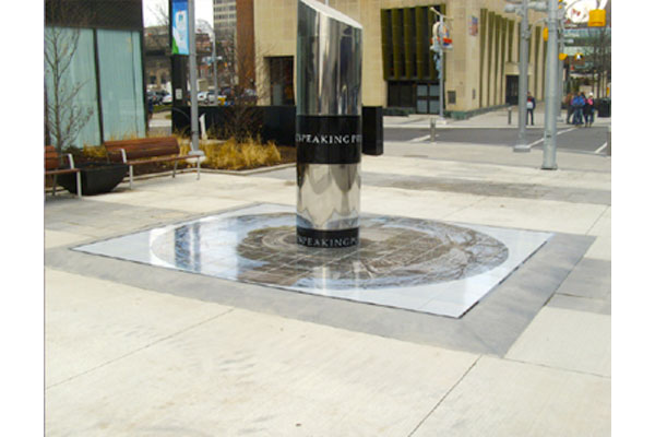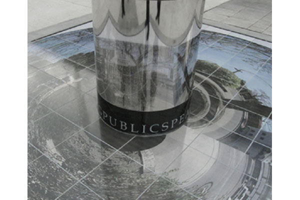 The Speaker's Corner: This public art concept touches on the relocation of memory of the site presently identified as Speakers Corner. Through incorporating literal and abstract images based on source pictures of the current site, an interactive experience is provided for the viewer. The sculpture is a combination of abstracted colored porcelain tiles (anamorphosis) reflected and transformed by a cylindrical stainless steel mirror into a recognizable image of the site before the modernization process.