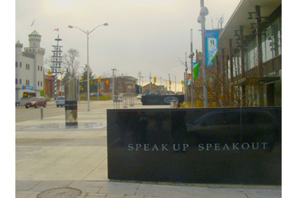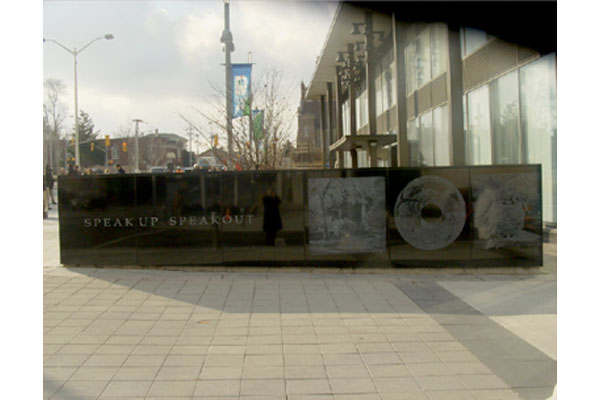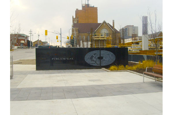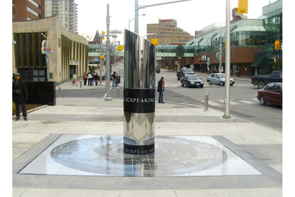 The varied menu of materials, applications and conceptual approaches result in unique artistic solutions for each public project undertaken; demonstrated through the social history implications of the Veterans Memorial, the urban and architectural context of the Pape Subway project,the community end use of the Activa Sportsplex and the reclaiming of an original civic purpose relating to the Speakers Corner project.