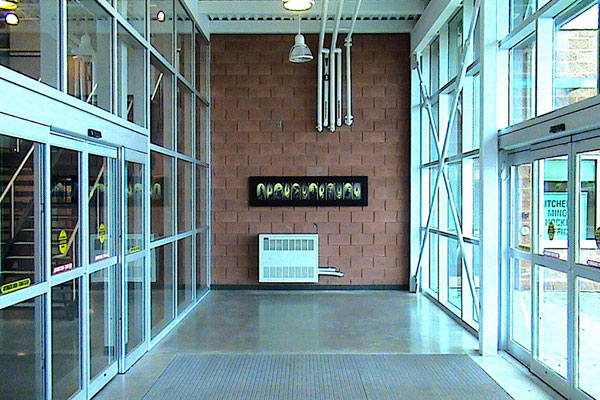 The art elements include an 8' x 24' exterior etched granite frieze. The interior applications include 70 sq ft of etched glass, a 1' x 6' ceramic tile frieze and six -4'x 3' back lit wall units.