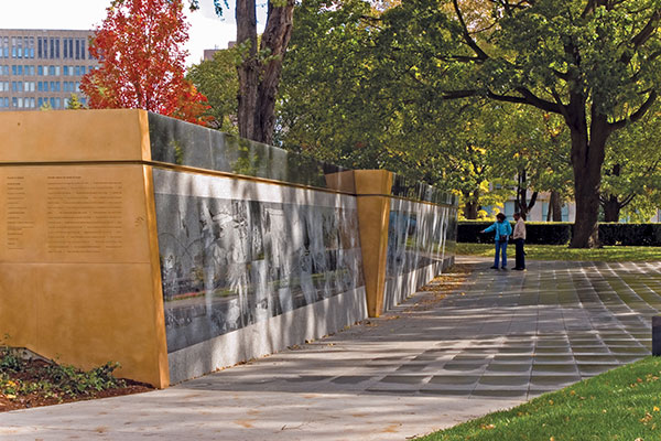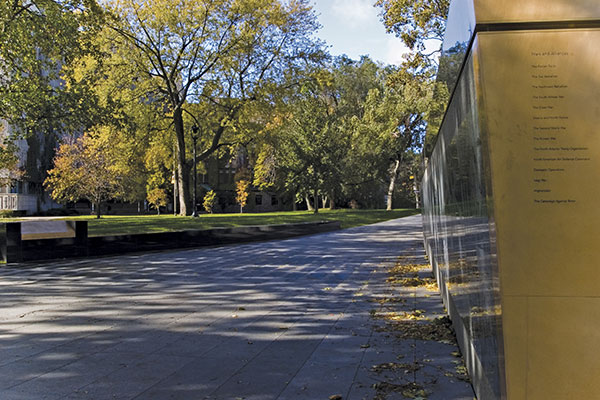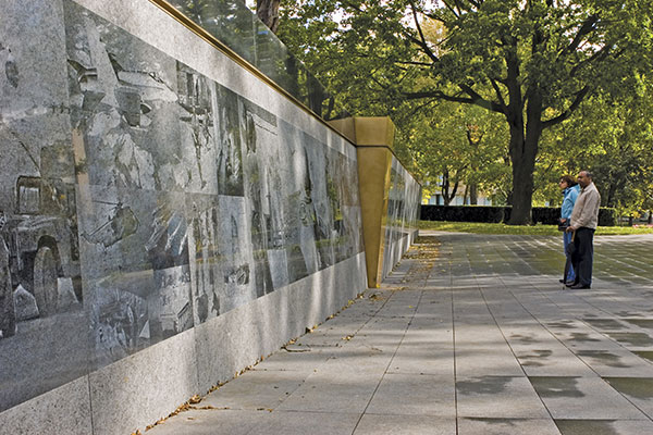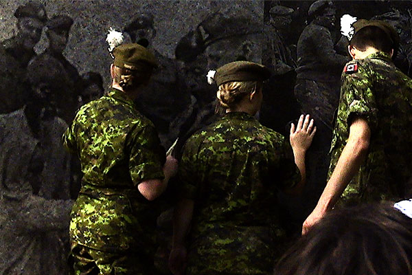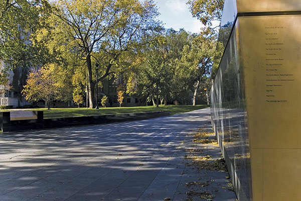 The Veterans Memorial, chosen from a nationwide competition and unveiled September 17, 2006; is a 30 metre long granite wall, machine and hand engraved with 45 scenes from Canada's war history from Confederation to the present day.