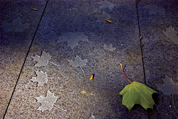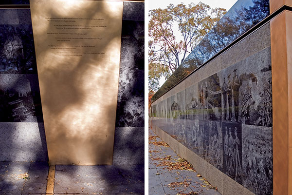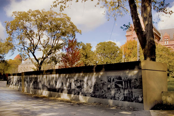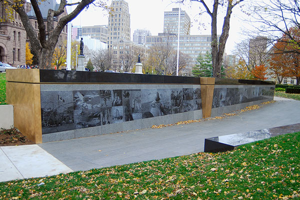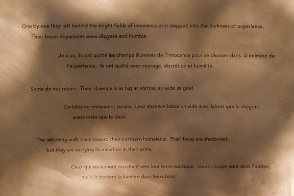 Designed in collaboration with architect Greg Smallenberg, the central bronze element contains poetic text by Jane Urquhart and the end bronze walls contain historical text. Other details include water jet maple leaves engraved on the plaza tiles and a red maple tree strategically placed at the back of the wall.